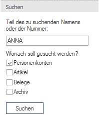 Danach kann entschieden werden, in welchen Datenbereichen (Objekten) gesucht werden soll. Dabei stehen die Bereiche Personenkonten (inkl. Interessenten), Artikel, Belege und das Archiv zur Verfügung (im Archiv werden alle relevanten Einträge gefunden werden, auf die der Suchbegriff zutrifft, z.B. auch wenn der gefundene Eintrag kein Beleg, Artikel oder Personenkonto beinhaltet).