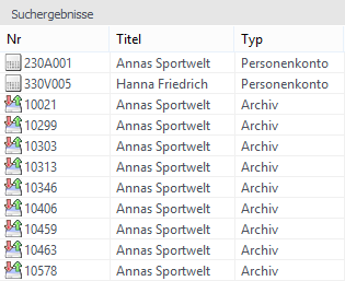 In der dritten Spalte wird dann nochmals der Typ des Suchergebnisses angezeigt, wobei hier ggf. noch eine detailliertere Anzeige (z.B. Beleg wird in Angebot, Auftrag, Lieferschein und Rechnung unterteilt) vorgenommen wird.