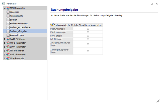 Über den Bereich "FIBU-Parameter - Buchungsfreigabe" können Einstellungen für die Buchungsfreigabe vorgenommen werden.
