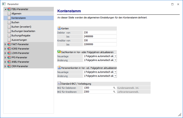 Über den Bereich "FIBU-Parameter - Kontenstamm" können allgemeine Einstellungen für den Kontenstamm vorgenommen werden.