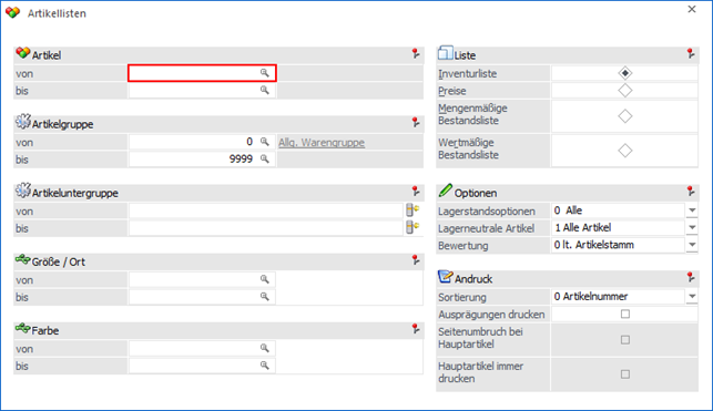 In der Auswertung "Artikellisten" (Typ "Inventurliste) wird der Artikelmatchcode aufgerufen. Nach der Suche werden die gewünschten Einträge in Tabelle der Suchergebnisse markiert und können mittels Drag & Drop in jenes Feld gezogen werden, von dem aus vorhin der Matchcode aufgerufen wurde (in diesem Beispiel das Feld "Artikel").