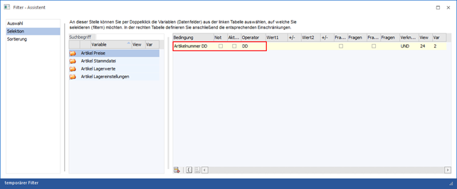 Dies bewirkt, dass ein temporärer Filter angelegt wird, welcher genau diese Einträge beinhaltet. Wenn über "Filter bearbeiten" der temporäre Filter zur Bearbeitung geöffnet wird, wird im Bereich "Selektion" das Filterkriterium mit dem Operator DD (steht für Drag & Drop) angezeigt.