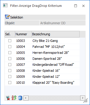Durch einen Doppelklick auf das Feld "Wert1" öffnet sich das Fenster Filter-Anzeige DragDrop Kriterium, in welchem die einzelnen Selektionskriterien angezeigt werden. In diesem Fenster ist es möglich, einzelne Einträge zu entfernen. Dazu muss die Checkbox "Sel." der betroffenen Einträge aktiviert, der Löschen-Button gedrückt und dieses mit dem Button "Ok" gespeichert werden.