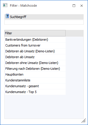 Im "Filter - Matchcode" werden alle Filter, welche für die Auswertung definiert wurden, angezeigt. Durch Auswahl eines Filters wird dieser in die Filterauswahl übernommen.