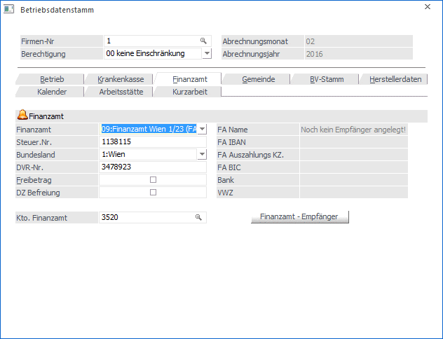 Durch Anklicken des Buttons Finanzamt - Empfänger können die Stammdaten bezüglich Adresse und Bankverbindung des Finanzamts hinterlegt werden. Diese Information wird benötigt, wenn die Zahlungen an das Finanzamt im Zuge der Monatsauswertungen aus dem System erstellt werden sollen (Clearingübergabe). Bei den Empfängerdaten sollten zumindest die Informationen Name und Adresse sowie die Bankverbindung (Register Detail) angegeben werden.