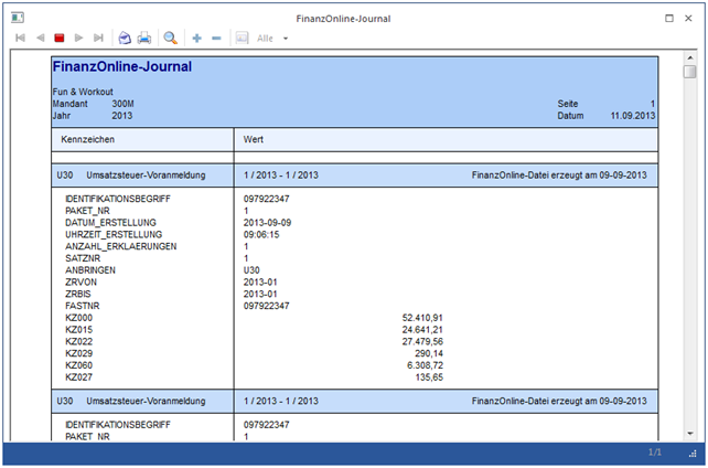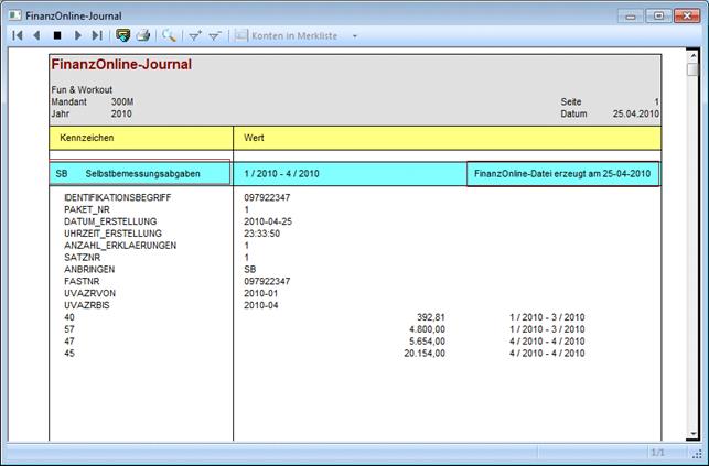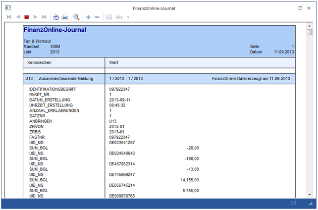 D.h. im FinanzOnline-Journal befinden sich alle Werte von erzeugten "UVA - XML-Dateien", sowie erzeugten "ZM -XML-Dateien", erzeugten "SB - XML-Dateien" bzw. gespeicherten "SB - Werten" und erzeugten "Vorsteuererstattungs-XML-Dateien.:
