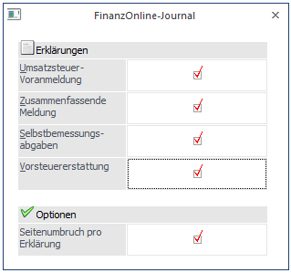 Durch Aktivieren der Checkboxen kann entschieden werden, welche Erklärungen bei Ausgabe des FinanzOnline-Journals berücksichtigt werden sollen: