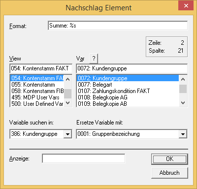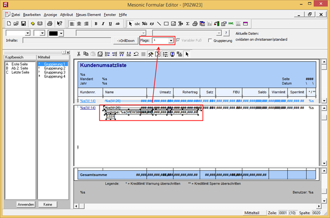Im nächsten Schritt werden nochmals die beiden Variablen Umsatz (54/60) und Rohertrag (54/62) eingebaut. Alle drei neu definierten Einträge bekommen das Flag "1 - Group Definition 1" zugeordnet. Damit wird bestimmt, dass diese Variablen nur bei einer Zwischensumme gedruckt werden. Danach kann das Formular gespeichert werden.