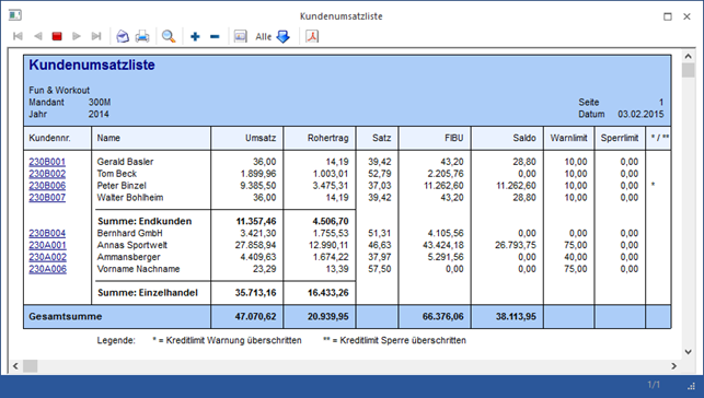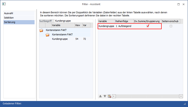 Als letzter Schritt wird in der WinLine FAKT die Kundenumsatzliste unter Anwendung eines Filters ausgedruckt, wobei im Filter nach Kundengruppe sortiert wird. Hierbei muss definiert werden, dass bei einem Kundengruppenwechsel eine Zwischensumme ausgegeben werden soll.