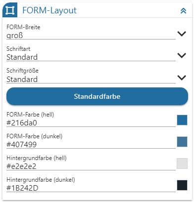 Im Bereich FORM-Layout können Einstellung bezüglich der Schriften und Farben Für die Formularauswahl "Formular", "Multi FORM" und "individuelles Formular" getätigt werden.