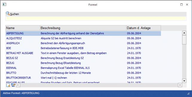Nach Aufruf des Fensters werden in der Tabelle alle bereits angelegten Formeln mit dem Formelnamen, der Bezeichnung und dem Anlagedatum angezeigt. Grundsätzlich ist in der Standardauslieferung eine Sammlung von Formeln enthalten, die die wichtigsten und häufigsten Möglichkeiten der Erfassung von Lohnarten abdecken.
