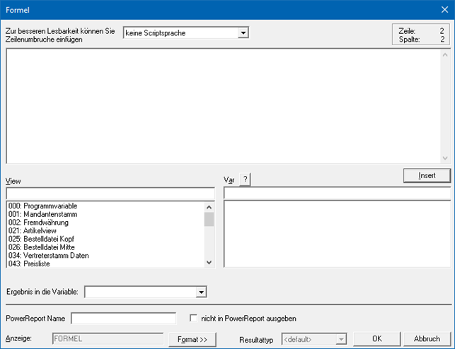 Mit Hilfe der Buttons "Insert" wird die ausgewählt Variable (siehe "View / Var") in das Eingabefeld der Formel übernommen. Je nachdem, welche Formelsprache gewählt wurde, wird die Variable wie folgt dargestellt: