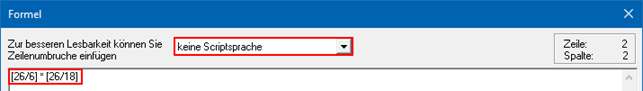 In das Eingabefeld der Formel wird in Abhängigkeit der Formelsprache der Code hinterlegt. Neben der eigentlichen Sprach-Syntax ist auch auf die unterschiedliche Schreibweise der Variablen zu achten: