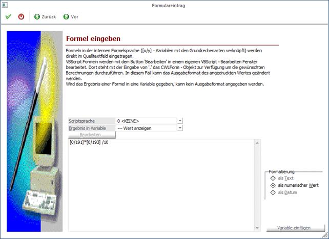 Durch Anklicken des VOR-Buttons gelangt man in das nächste Fenster, wo die Formel erfasst werden kann.