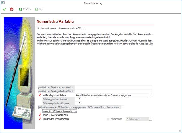 Durch Anklicken des VOR-Buttons können weitere Einstellungen zum Andruck der Variable eingegeben werden. Durch Anklicken des ZURÜCK-Buttons kann nochmals der Typ verändert werden. Durch Drücken der F5-Taste wird der Eintrag in das Formular übernommen. Durch Drücken der ESC-Taste wird das Fenster geschlossen.