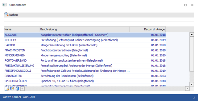 Mit dem Suchbegriff wird in den Spalten "Name", "Beschreibung", als auch im Formeltext selbst (also dem Inhalt der Formel) gesucht. Wird z.B. "PriceCalculation" als Suchbegriff eingegeben, werden alle Formeln angezeigt, welche eine Preisfindung ausführen.