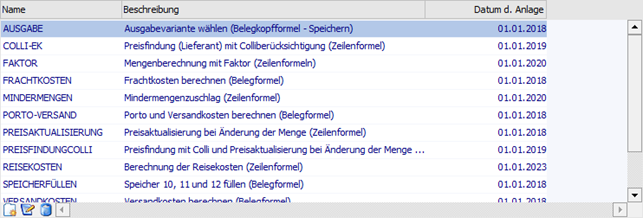 Nach Aufruf des Fensters werden in der Tabelle alle bereits angelegten Formeln mit dem Formelnamen, der Bezeichnung und dem Anlagedatum angezeigt. Formeln werden in der Tabelle T030CMP in der Systemdatenbank gespeichert.