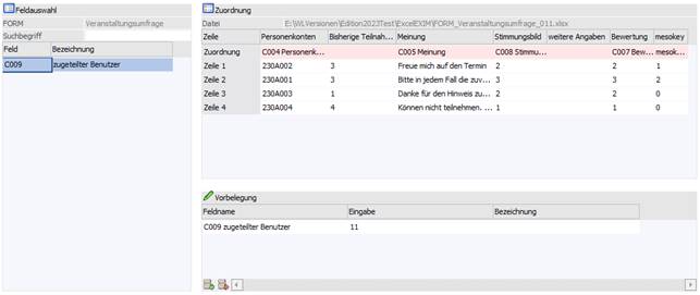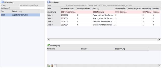 Die Zuordnung ermöglicht bei einer manuellen Vorbelegung im Zusammenspiel mit Treibertyp/Treiber "Excel" ein Verknüpfen der Felder der Importquelle zur selektierten FORM.