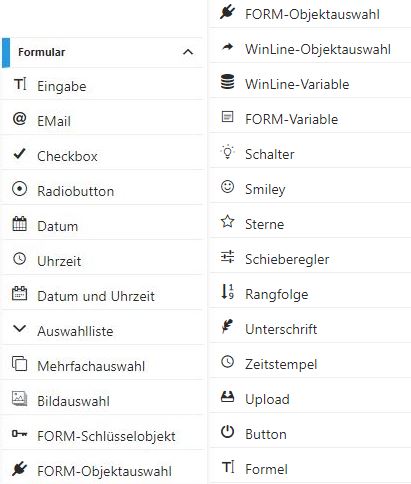 In einer FORM stehen unterschiedliche Felder zur Verfügung (im FORM Designer sind diese Felder im Bereich "Formular" aufgelistet). Nachfolgend werden die Funktionen der einzelnen Elemente beschrieben.