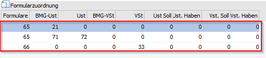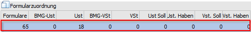 Die Position 71 enthält den Gesamtbetrag der Bemessungsgrundlagen für 5 %ige innergemeinschaftliche Erwerbe. D.h. in der Steuerzeile muss bei den entsprechenden Zeilen (Steuerzeile mit 5 %) bei der BMG UST 71 eingetragen werden. Da dieses Feld aber schon mit der Position 21 belegt ist, wird eine zweite Zeile eröffnet, wo das Formular 65 eingetragen wird. Dort kann die Position 71 bei der BMG UST hinterlegt werden. Pro Steuerzeile kann ein Formular auch öfters verwendet werden, so dass jede Steuerzeile an jeder beliebigen Position hinterlegt werden kann.
