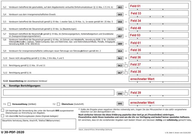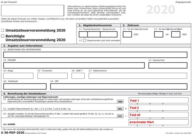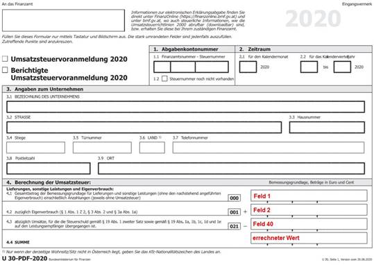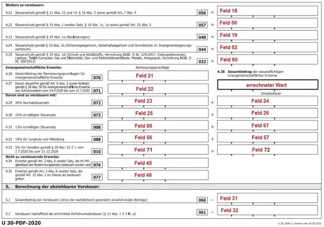 Für die Ausgabe des UVA-Formulars ab 07/2020 befindet sich die Kennzahl 010 auf der dritten Seite des UVA-Formulars. Dies entspricht dem Formular mit der Nr.65. Die Bemessungsgrundlage für die Erwerbssteuer mit der Position 21 befindet sich auf der dritten Seite des UVA-Formulars, dies entspricht dem Formular 65.