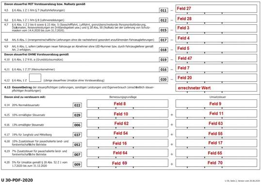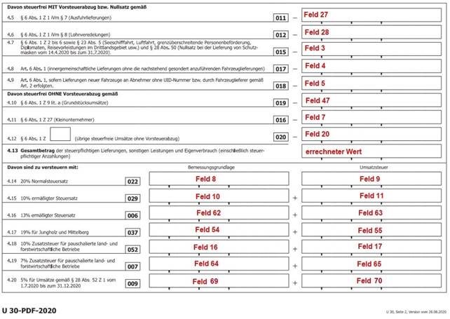 Für die Ausgabe des UVA-Formulars ab 07/2020 befindet sich die Kennzahl 056 nun auf der dritten Seite des UVA-Formulars. Dies entspricht nun dem Formular mit der Nr. 65 und der Position 18 (die Position bleibt gleich).