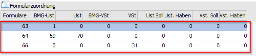 Die Position 69 enthält den Gesamtbetrag der Bemessungsgrundlagen für 5 %ige Umsätze. D.h. in der Steuerzeile muss bei den entsprechenden Zeilen (Umsatzsteuerzeilen mit 5 %) bei der BMG UST 69 eingetragen werden. Damit muss in der zweiten Zeile das Formular 64 eingetragen werden. Dort kann die Position 69 bei der BMG UST hinterlegt werden. Pro Steuerzeile kann ein Formular auch öfters verwendet werden, so dass jede Steuerzeile an jeder beliebigen Position hinterlegt werden kann.