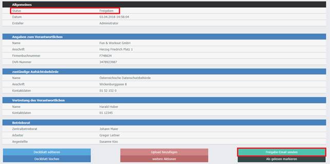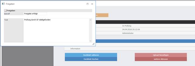 Um zugewiesene Benutzer von der Freigabe zu informieren, kann ein Infomail versandt werden. Dazu muss der Button "Freigabe Email senden" gedrückt werden, der angezeigt wird, sobald der Status "Freigegeben" vergeben wurde. Nähere Informationen dazu gibt es im nachfolgenden Kapitel E-Mail Benachrichtigungen.