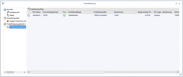 Im obigen Bildschirm ist ein FFG-Arbeitsschritt mit Status "Arbeitsschein gedruckt" versehen. Es wird daher ein eigener Ordner im Baummenü für diesen Status angelegt und alle FFG-Arbeitsschritte werden im Ordner angezeigt, die diesen Status aufweisen. Arbeitsschritte, wofür ein Lieferschein bzw. Faktura schon gedruckt worden ist, werden beispielsweise in einem eigenen Ordner "Lieferschein/Rechnung eingelangt" im Baummenü sortiert.