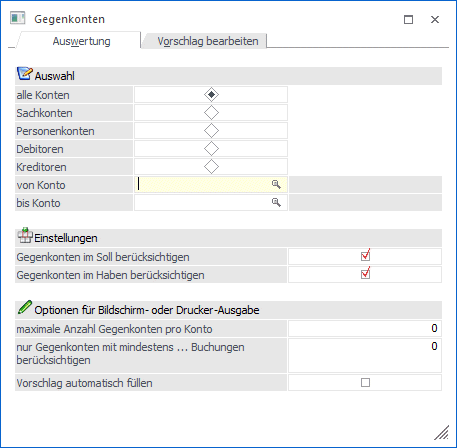 Hier kann eine Anzahl von Gegenkonten eingetragen werden, die maximal pro Konto ausgegeben werden sollen. Bei "0" werden alle Gegenkonten berücksichtigt.