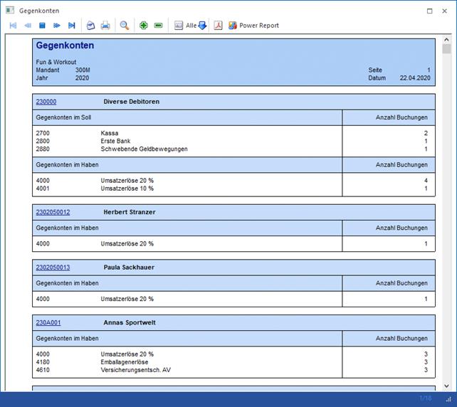 Auf der Auswertung der Gegenkonten werden für die ausgewählten Konten nur die Gegenkonten im Haben aus dem Journal ausgegeben.
