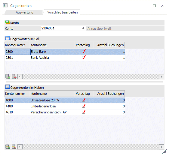 In dem Register "Vorschlag bearbeiten" werden für eine eingegebene Kontonummer die definierten Gegenkonten im Soll und im Haben in zwei Tabellen angezeigt und können dort editiert werden.