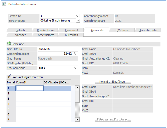 In der Tabelle "Fixe Zahlungsreferenzen" kann sowohl für die Kommunalsteuer als auch für die DG-Abgabe (U-Bahn) für jede Periode eine Zahlungsreferenz hinterlegt werden, wenn diese von der Gemeinde vorgegeben wird. Wird in der Tabelle keine spezifische Zahlungsreferenz hinterlegt, so wird die Zahlungsreferenz aus der Definition des KommSt - bwz. DG-Abgaben - Empfänger gebildet.