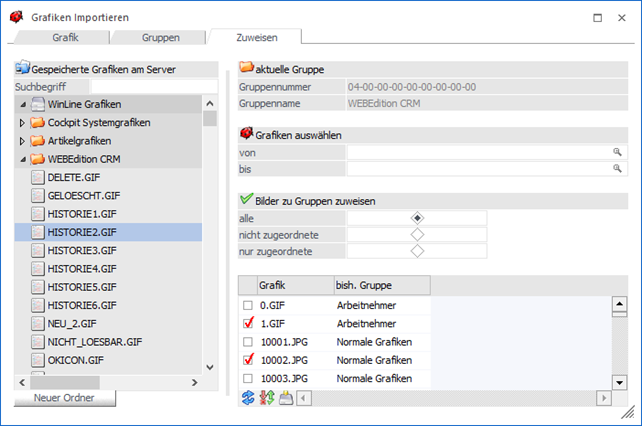 Im Register "Zuweisen" können Grafiken zu bestehenden Grafik-Gruppen zugeordnet werden. Dieses ist dann sinnvoll, wenn viele Grafiken verwalten werden (z.B. in Zusammenhang mit der WEBEdition) - damit können die Grafiken übersichtlicher bearbeitet werden.