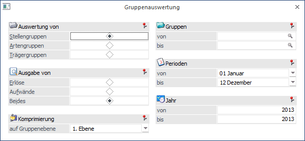 Geben Sie die Ebene ein, auf welcher die Komprimierung der Gruppenauswertung erfolgen soll. Es stehen bis zu 9 Ebenen zur Verfügung. Voraussetzung: In den Stammdaten für die Kostenarten/Kostenstellen/Kostenträger wurden bereits die Gruppen hinterlegt.