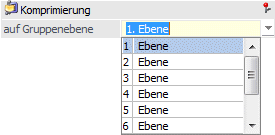Wenn Sie in der Gruppenauswertung bereits eine Auswertung auf Basis von Gruppennummern der Ebene zwei durchführen, erhalten Sie die 2. Ebene bereits in der Komprimierungsauswahl vorgeschlagen. Es erfolgt eine Summierung aller Buchungen der Ebene zwei bzw. der darunterliegenden Ebenen.