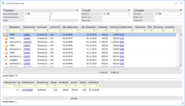 Dieser Menüpunkt dient zur übersichtlichen Darstellung der offenen bzw. bereits eingelösten Gutscheine mit verschiedenen Selektionsmöglichkeiten und Anzeigen.