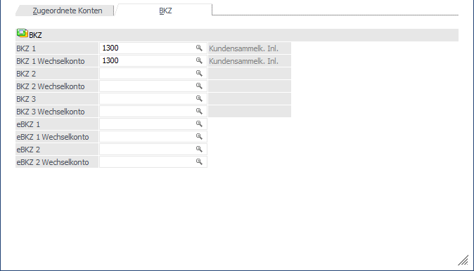 In diesem Register können die BKZ und eBKZ Einstellungen für das selektierte Hauptbuchkonto bearbeitet werden. Wenn das Konto in einem anderen Fenster bearbeitet wird, kann in diesem Fenster gearbeitet werden (alle Eingabefelder sind inaktiv) und eine entsprechende Infomeldung wird im Fenster angezeigt. Beim Editieren der BKZ-Einstellungen werden dieselben Prüfungen durchgeführt wie im Kontenstamm. Beim Speichern mittels OK-Button werden die BKZ in allen zugeordneten Nebenbuchkonten aktualisiert.