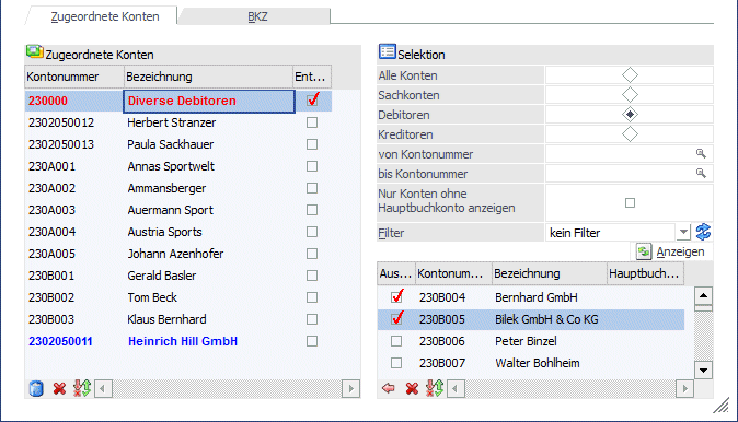 In diesem Register werden in der Tabelle links alle Konten angezeigt, die dem selektierten Hauptbuchkonto bereits zugeordnet wurden. Mit der Checkbox "Entfernen" in der Tabelle werden jene Konten selektiert, die nicht mehr als Nebenbuchkonto zu diesem Hauptbuchkonto verwendet werden sollen. Sobald die Checkbox gesetzt wird, wird das Konto rot dargestellt. Neu zugeordnete Konten werden blau dargestellt. Die Einstellung wird mit einem Klick auf den OK Button gespeichert.