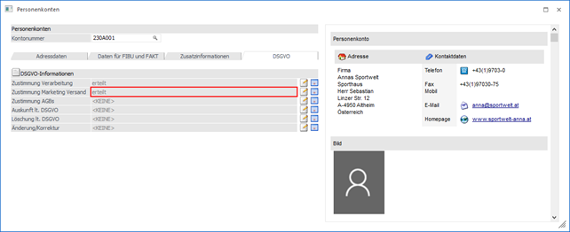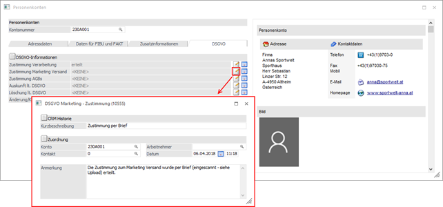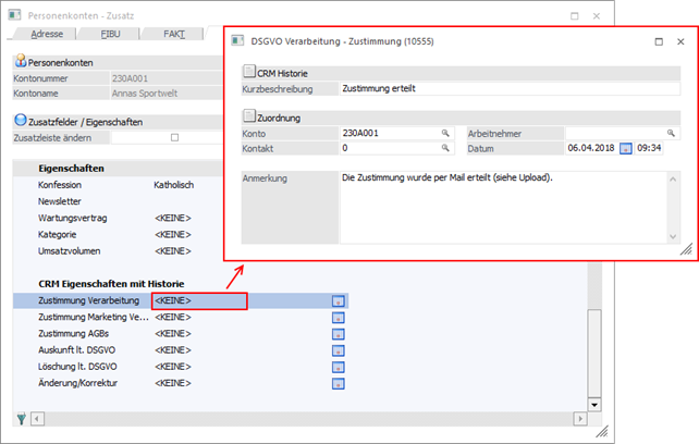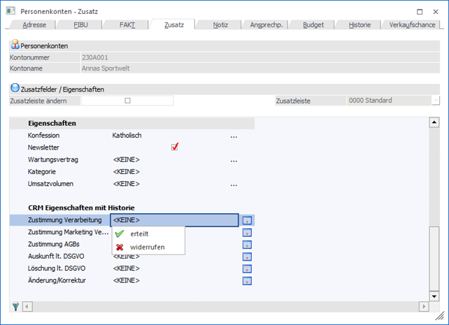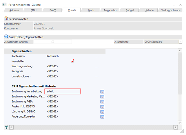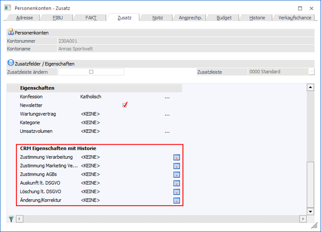 In den WinLine Stammdatenfenstern (Formular "0 - Allgemein") werden Eigenschaften des Typs "C - CRM Historie" in einem gesonderten Bereich dargestellt.