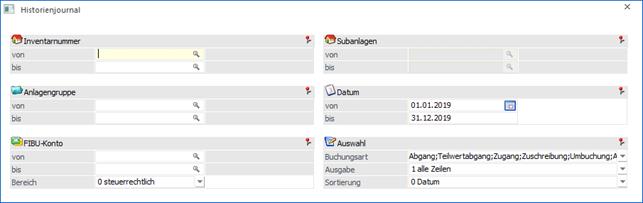 Im Historien-Journal können Historieneinträge in Journalform ausgegeben werden. Es kann auf die einzelnen Historientypen eingegrenzt werden (Abgang, Teilwertabgang, Zugang, Zuschreibung, Umbuchung, Abschreibung und Sonderabschreibung).