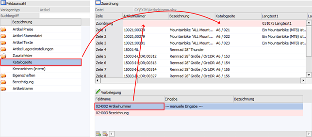 ü Jedes Datenfeld kann per Drag & Drop in eine Spalte der Tabelle "Zuordnung" (für eine 1 zu 1-Verbindung) geschoben werden. Soll während des Imports ein Feld der WinLine mit einem immer gleichlautenden Inhalt bzw. Werte gefüllt werden, so ist das Feld in die Tabelle "Vorbelegung" zu übernehmen.