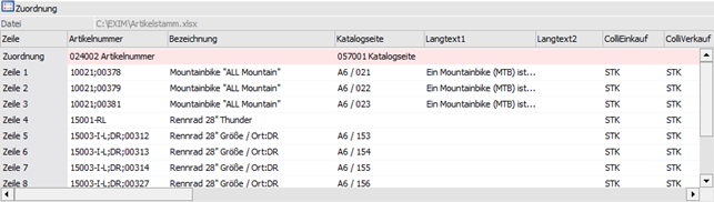 Wenn laut der Einstellung im EXIM-Fenster (sprechende Spaltenbezeichnung) eine Kopfzeile in der Datei vorhanden ist, so wird diese eingelesen und für die Bezeichnung der Spalten verwendet, andernfalls werden die Spalten hier durchnummeriert.