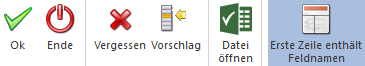 Mit diesem Button kann definiert werden, ob es in der Datei eine Überschriftenzeile gibt oder nicht. Durch Anwahl (Einschalten) des Buttons werden die Werte aus der ersten Zeile der Importdatei in die Kopfzeile der Tabelle "Zuordnung" übernommen; beim "Ausschalten" werden die Werte hingegen aus der Kopfzeile in die erste Datenzeile übernommen (und eine allgemeine Kopfzeile angezeigt).