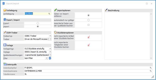 Im Zuge eines Imports wurde eine Vorbelegung selektiert und der Import mit den definierten Optionen durchgeführt.