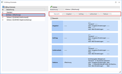 Im Register "Übersicht" werden dem Benutzer die wichtigsten Einstellungen, unterteilt in die vier weiteren Register Angebot bis Faktura, dargestellt. Dadurch kann der Benutzer auf einen Blick erkennen, in welchem Register bzw. für welche Belegstufe Einstellungen in diesem Schema hinterlegt wurden.