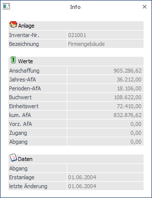 Nach Drücken des INFO-Buttons werden die wesentlichsten Werte des aktiven Anlagegutes angezeigt. (Anschaffung, AfA, TW-Abgang, letzte Änderung, usw.)