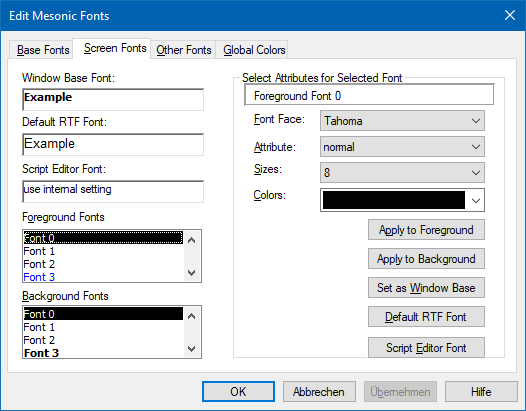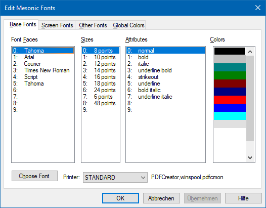 Die Datei MESOCOL.INI enthält die Informationen über verfügbare Schriftarten, -größen, -attribute und Farben.