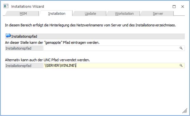 ü Wurde auf der Workstation ein Verzeichnis (z.B. WinLine) angelegt und dieses freigegeben, damit dort das Programm installiert werden kann, muss im Feld Installationspfad nur mehr ein Backslash \ eingegeben werden.