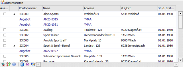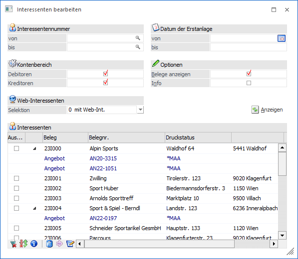 Wenn die Option "Belege anzeigen" aktiviert ist, werden zu jedem Interessenten die Belege, in denen er als Rechnungsadresse oder als Lieferadresse vorkommt, angezeigt.